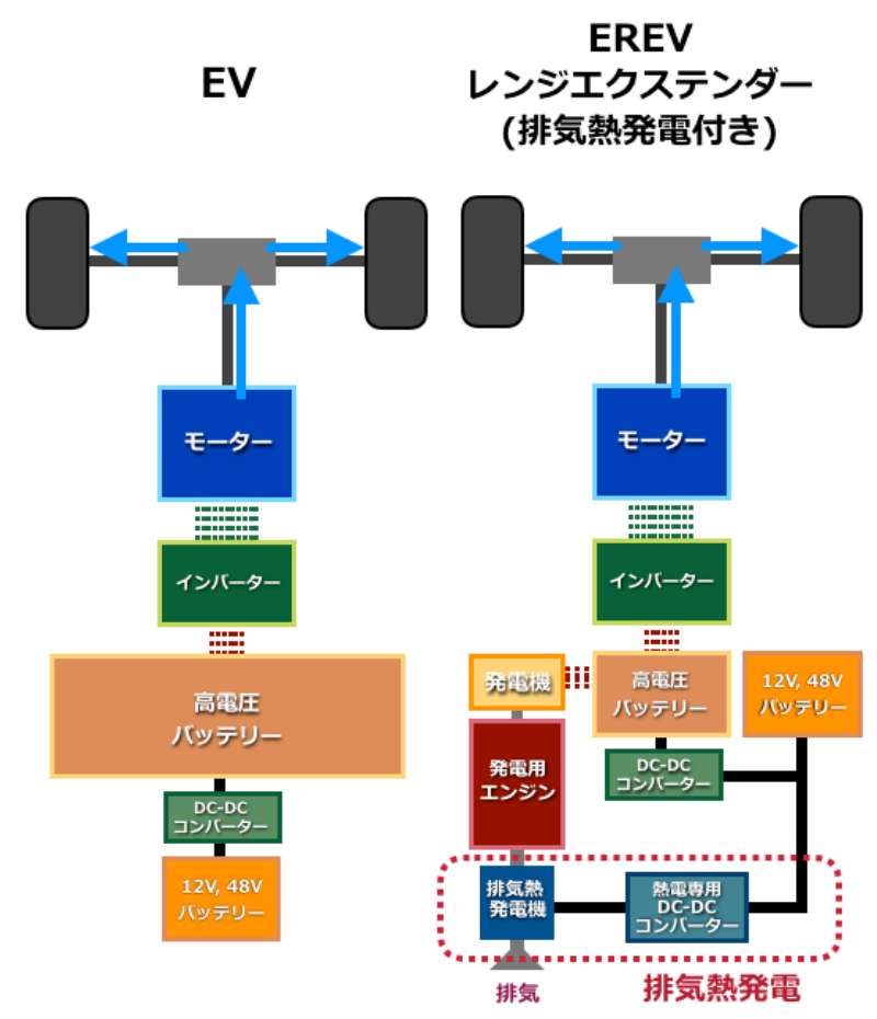 エンジンを搭載する電動車(ストロング/マイルド・ハイブリッド系、発電機搭載EV系)の未利用排気熱から熱電発電方式で回生電力化を行い、電動車において需要が逼迫している車載電力を補うことで、エンジン搭載電動自動車における燃費改善(CO2削減) に資する取組みを実施しています。先進工業国では急進的な低炭素目標(カーボンニュートラル)の設定に伴い、今後EREVやPHEVエンジンが主流となりますが、車載排気系排熱発電システムに関する実装関連の複合的な技術課題の解決が行われていないため、CO2削減に資する技術であると認識されながら実用化できていない点に対する実装実証面での技術開発を推進します。