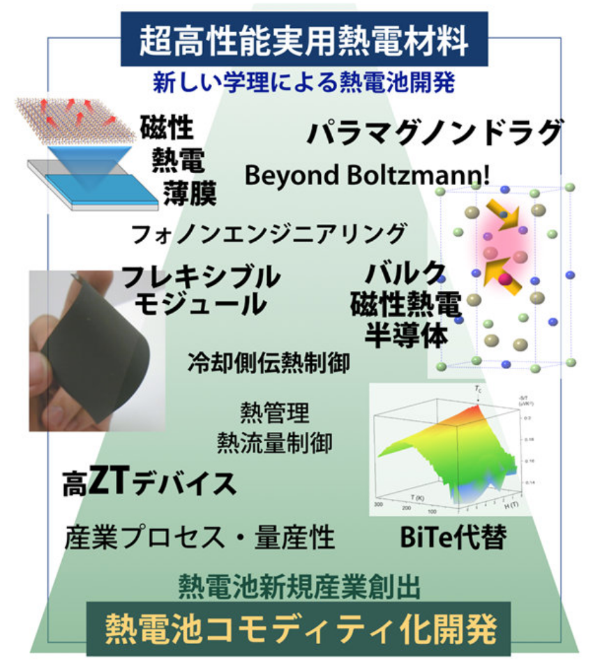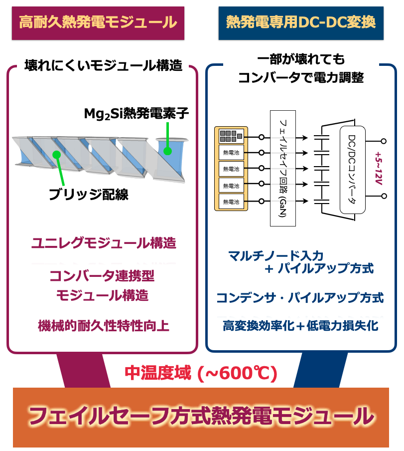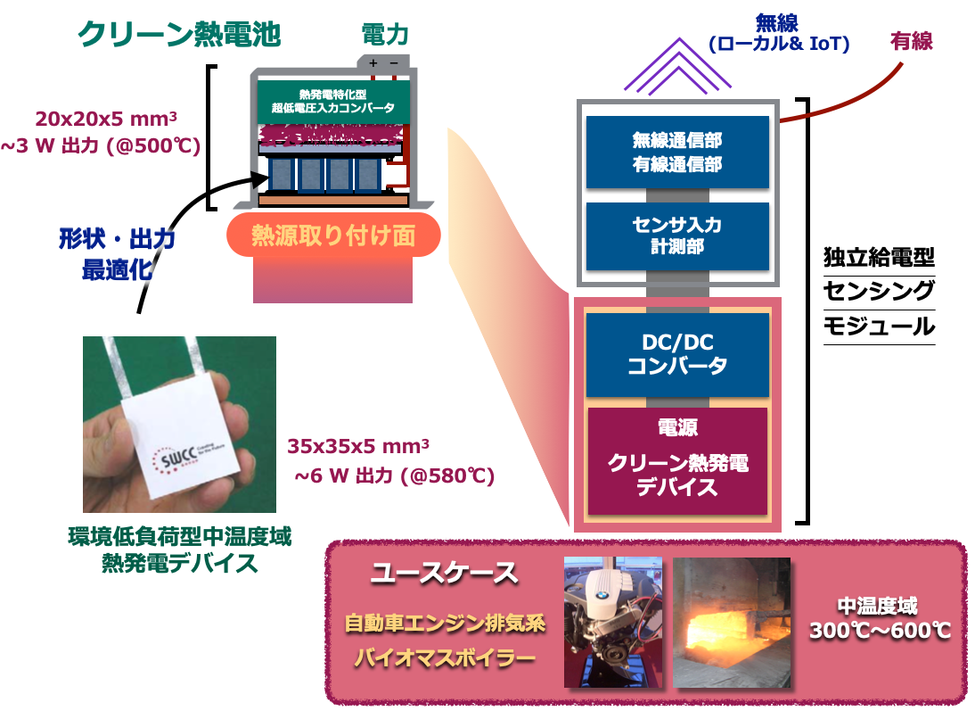 デバイスの実装および実証評価事業推進に当たっては、中温度域熱源(300℃~600℃)に環境低負荷型熱発電デバイスを実装して電源とする「熱電池デバイス」として導入し、自動車エンジン排気系製造会社、ボイラー製造会社と連携して