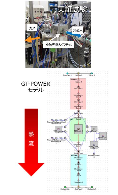②熱電発電モジュールの性能評価と熱効率寄与評価 (GT-POWERシミュレーター)中低温度域熱電モジュールを開発しエンジン排気系ベンチでの実証試験・伝熱精密解析によるエンジンシミュレーション環境のGT-POWERモデルを構築排気系熱発電システムの新規解析法を明確化し、自動車の開発で多用されているモデルベース開発(MBD)に対応した熱電発電のシミュレーション環境を構築