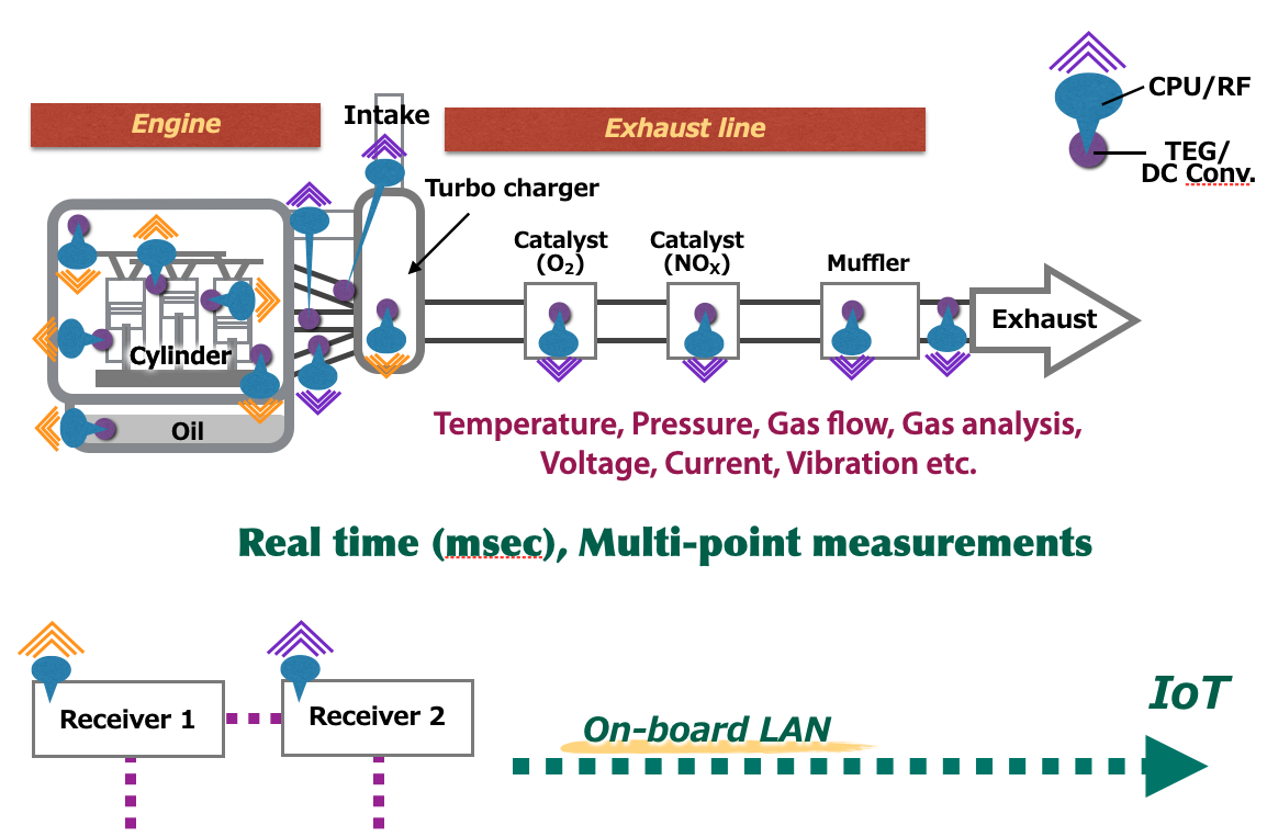 における熱源に「熱電池デバイス」をコアとする独立給電型センシングモジュールを実装し、エンジンおよびボイラーの高効率制御化に必要な稼働パラメータのモニタリングシステムの実証を行いました。